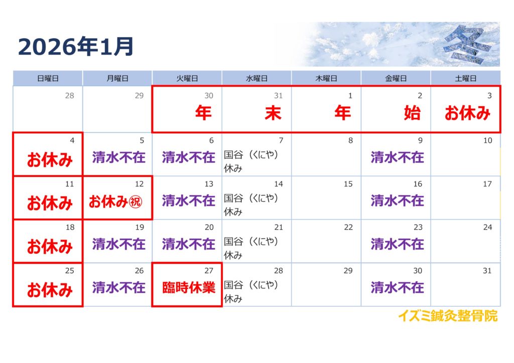 2026年1月5日 / 最終更新日 : 2026年1月5日 管理者 お知らせ 2026.1のお休み 明けましておめでとうございます。本年も宜しくお願い致します。 1/5(月)から通常営業となります。 日曜日・祝日と1/27(火)が臨時のお休みとなります。 よろしくお願いいたします。